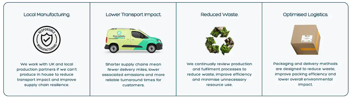 We specialise in bespoke label solutions for sectors such as food, logistics, healthcare and retail, alongside sustainable packaging formats, eco-conscious signage and environmentally responsible print consumables. All products are designed to meet real-world performance requirements while offering more responsible material choices, including recycled, recyclable and FSC-certified options.