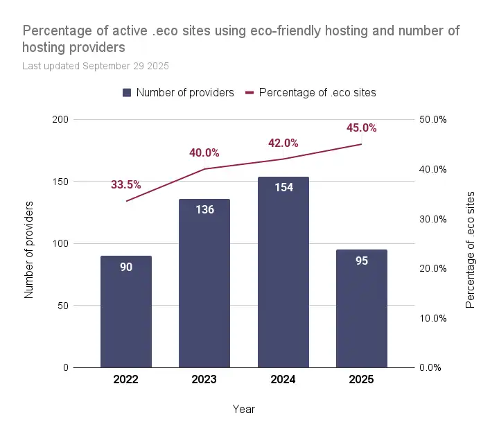 As of September 29, 2025, 45% of active .eco websites use an eco-friendly web hosting provider. This is a slight increase from last year.
